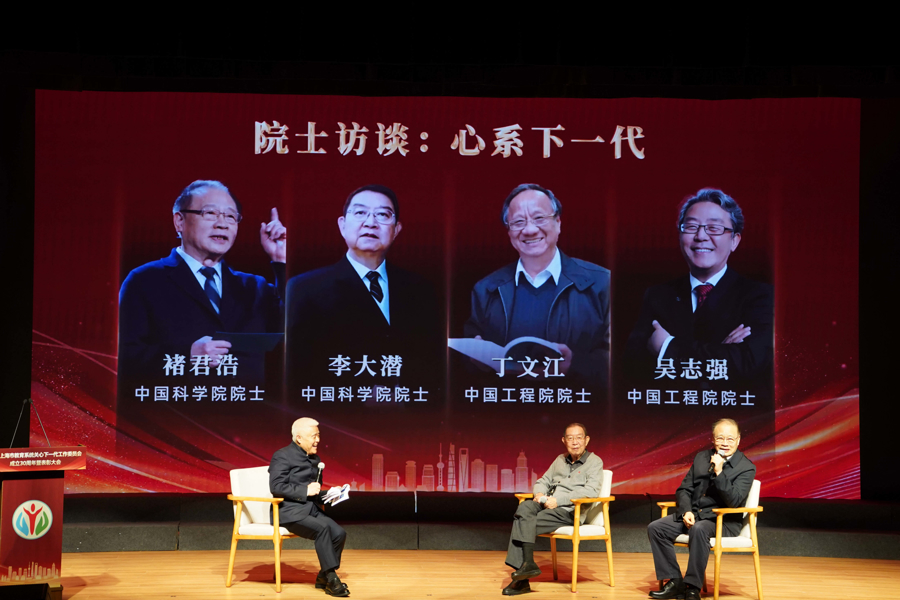 第二篇章“枫叶正红”集中展现“五老”风采与育人力量。少儿歌舞《阳光下的花朵》活泼灵动,用童真与活力彰显新一代青少年的蓬勃朝气。“五老故事”分享环节中,闵行区教育系统关工委赵妙娟讲述《光荣在党五十年 一片丹心有新人》,同济大学关工委金正基分享《做青年的朋友》,上海市劳模协会工会管理学院劳模学员分会会长王连云阐释《劳模精神永放光芒》,上海交通大学博士生蒋函静以《读懂中国 饮水思源》传递青年一代对“五老”的感恩之心,生动诠释“老少牵手、共促成长”的育人成效。主题为“心系下一代”的院士访谈引发广泛共鸣,中国科学院院士李大潜、褚君浩与中国工程院院士丁文江、吴志强结合自身科研与育人经历,寄语青少年立大志、明大德、成大才,勇担时代重任。